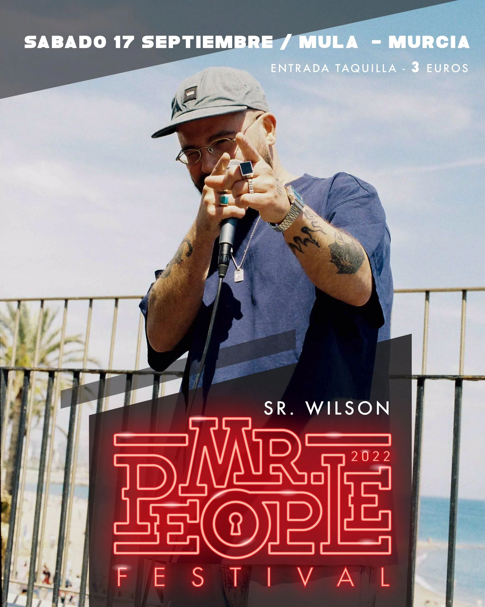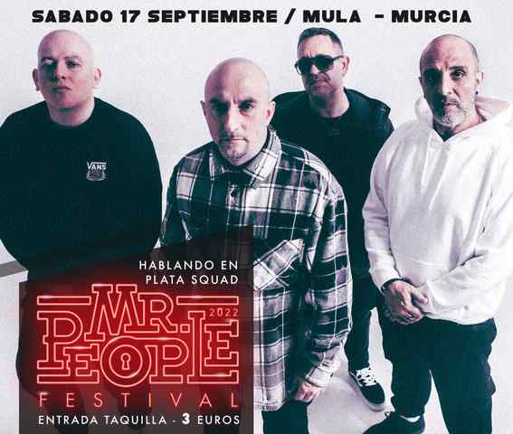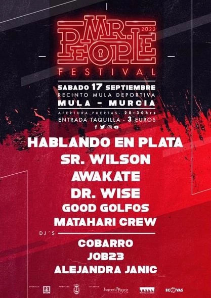 Este año tendremos una edición de lujo, contando con HABLANDO EN PLATA como cabeza de cartel, los cuales vuelven a los escenarios en 2022 para celebrar su 20 aniversario. Considerados por crítica y público como el gran grupo de rap español junto con los históricos Violadores del Verso, SFDK y CPV.También estará con nosotros SR WILSON, al que le tenemos muchas ganas, ya que era el cabeza de cartel de la edición 2019, la cual tuvo que suspenderse. No te pierdas a uno de los artistas más representativos de la escena reggae.Y por último contaremos como artistas principales a una de las bandas murcianas que con más fuerza están emergiendo AWAKATE, si los has visto ya en concierto, sabrás qué pondrán el escenario del Mr People Festival patas arriba.Todo esto muchos por más artistas por solo 3 euros, ¿te lo vas a perder?
