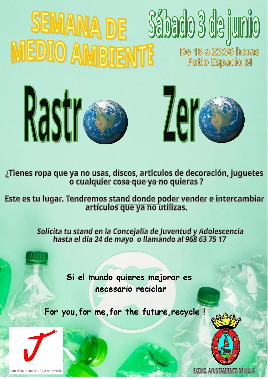 La Concejalía de Juventud y Adolescencia del Ayuntamiento de Mula organiza Rastro Zero, un mercadillo de segunda mano que tendrá lugar el sábado, 3 de junio, en el patio del Espacio M. Se trata de un evento celebrado con motivo del 5 de junio, Día Mundial del Medio Ambiente.