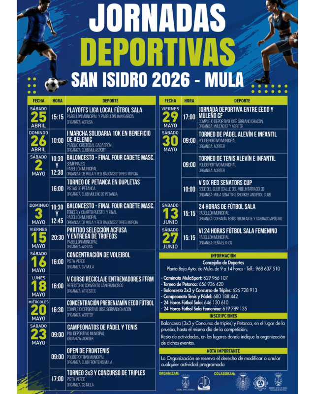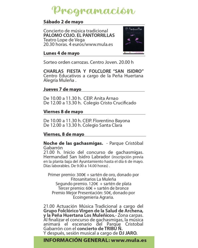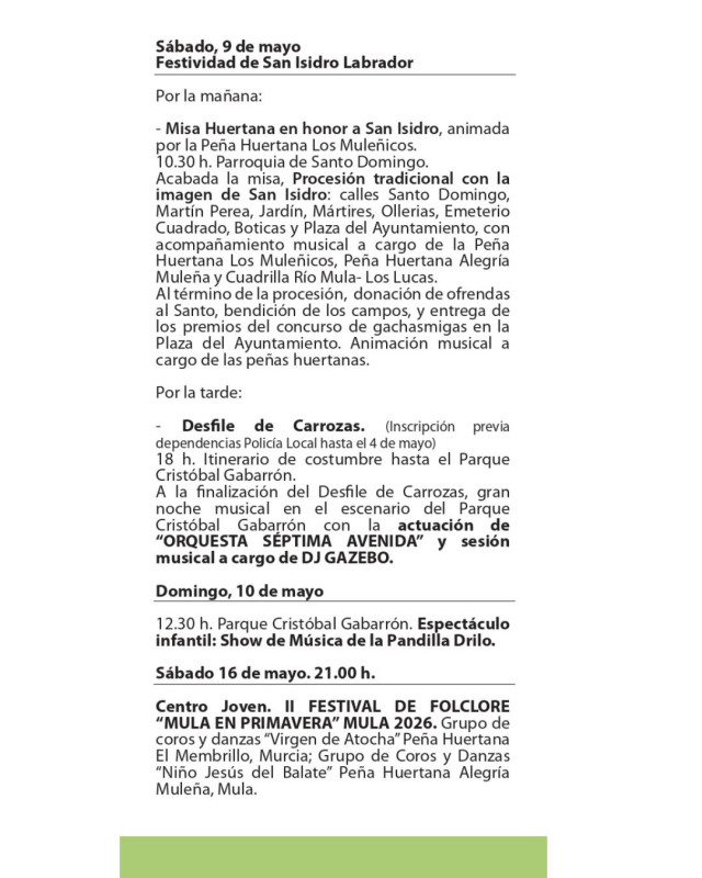 Alicia Zapata ha explicado que “el sábado es el día principal”, con la misa huertana y la procesión de San Isidro por las calles de Mula, acompañada por peñas y música tradicional. Por la tarde tendrá lugar el desfile de carrozas, y la jornada concluirá con una gran noche musical con orquesta y DJ.