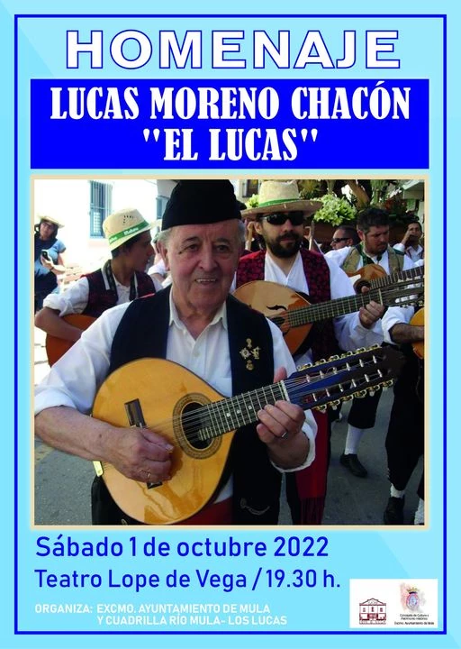 La concejalía de Cultura del Ayuntamiento de Mula, en colaboración con la Cuadrilla Río Mula Los Lucas organizan para el próximo sábado 1 de octubre a las 19.30 horas en el Teatro Lope de Vega una Gala Homenaje para Lucas Moreno Chacón ‘El Lucas’.Se trata de un reconocimiento más que merecido a toda una trayectoria dedicada al mundo del folclore, por su trabajo y su tesón por cultivar y promocionar el folclore no sólo de Mula y su comarca sino de toda la Región de Murcia, según ha resaltado el concejal de Cultura, Diego Boluda.Participarán en la gala la peña Alegría Muleña, la peña Los Muleñicos y la propia Cuadrilla de Los Lucas.