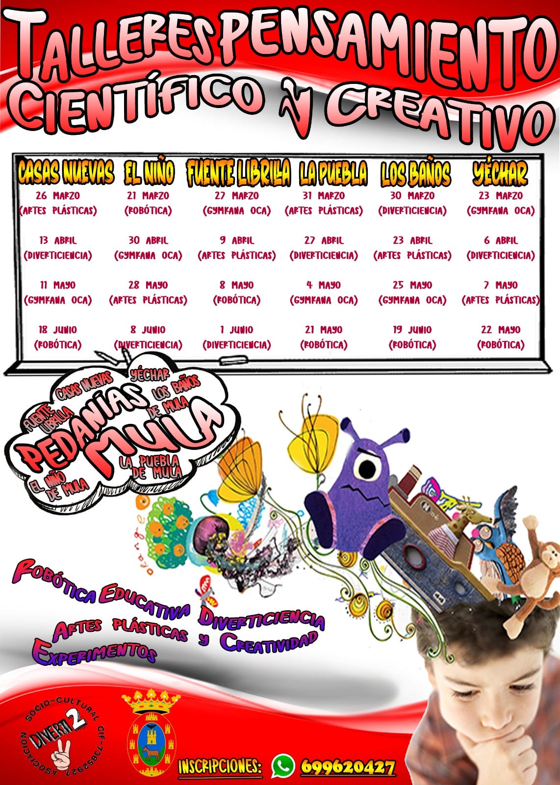 Presentan la programación de los talleres de pensamiento científico y creativo de las pedanías de Yechar, Los Baños, La Puebla, El Niño, Fuente Librilla, Casas Nuevas. Se trata de una iniciativa pionera hasta ahora en el Municipio, cuyos talleres se llevarán a cabo durante los meses de marzo, abril, mayo y junio. El concejal de Educación y Cultura, Diego Boluda, junto con la concejala de Pedanías, Candelaria Navarro; Miguel Ángel Gómez, presidente de la Junta Vecinal de Fuente Librilla y Ginés Ortín, pedáneo de El Niño de Mula, presentaba esta serie de talleres cuya finalidad es la de implementar más actividades socioeducativas y culturales dirigidas a la población infantil y juvenil de los núcleos rurales del municipio. Con ello, el Equipo de Gobierno del Ayuntamiento de Mula continúa la línea de trabajo de implementar y dotar de numerosas actividades socioculturales a nuestras pedanías. Creación artística, ciencia, robótica y ludicidad son los talleres que contribuirán a estimular el desarrollo del pensamiento creativo, crítico y científico, que arrancarán a finales del mes de marzo en colaboración con las Juntas Vecinales y los alcaldes y alcaldesas pedáneas de El Niño de Mula, Los Baños de Mula, Yéchar, Casas Nuevas, la Puebla de Mula y Fuente Librilla. Los interesados podrán inscribirse a través del número de teléfono que aparece en la cartelería, así como solicitar información a través de las juntas vecinales o en la propia concejalía de Educación. Diego Boluda afirmaba que “es una iniciativa pionera en nuestro municipio, dirigida y organizada exclusivamente para los niños y niñas de las pedanías, que viene a evidenciar que toda oferta cultural y educativa que se realiza en Mula integra y tiene muy en cuenta a toda la población juvenil, ya vivan en Mula o en una pedanía”. Por otra parte, los representantes de El Niño y de Fuente Librilla reconocían y ponían en valor la realización de este tipo de actividades que vienen a enriquecer la oferta educativa y cultural que se viene haciendo en las pedanías. La concejala de Pedanías y el concejal de Educación agradecían el trabajo de Juan Francisco Díaz, de Diverti2, quien está organizando y dinamizando dichas actividades.