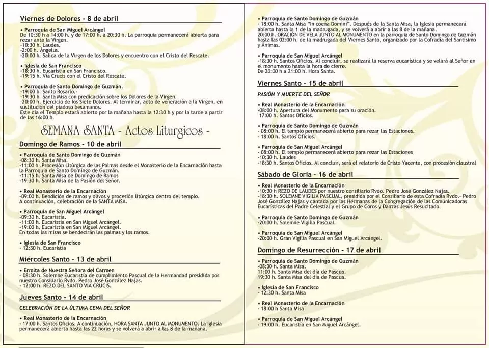 Programación de actos litúrgicos y procesionales desde Viernes de Dolores a Domingo de Resurrección.
