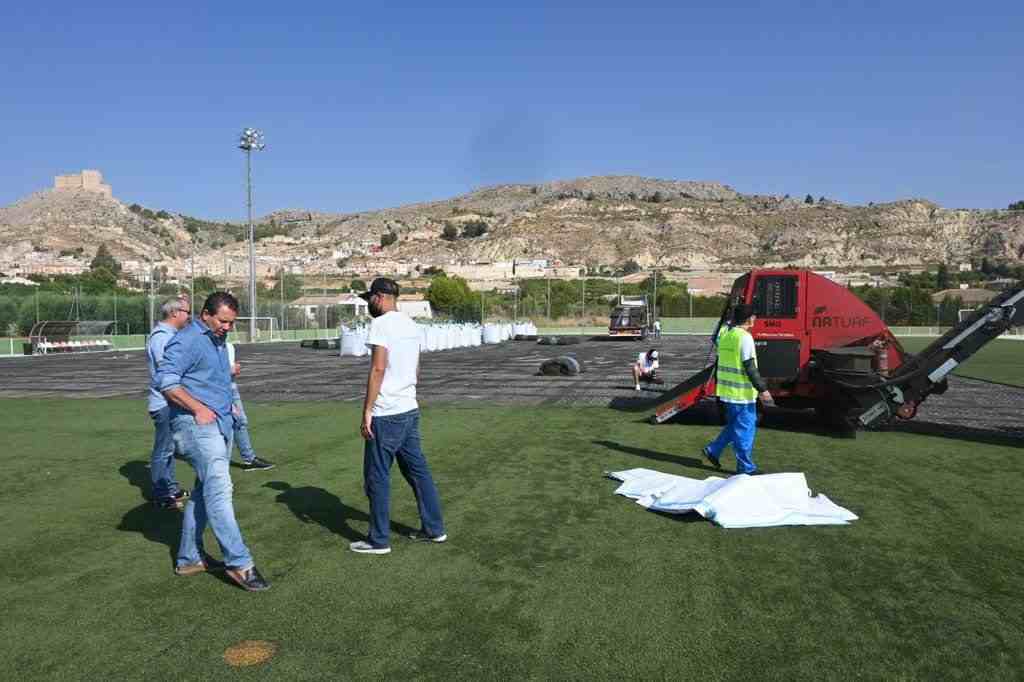 El Ayuntamiento de Mula sustituye el césped artificial del Complejo Deportivo José Soriano Chacón.
