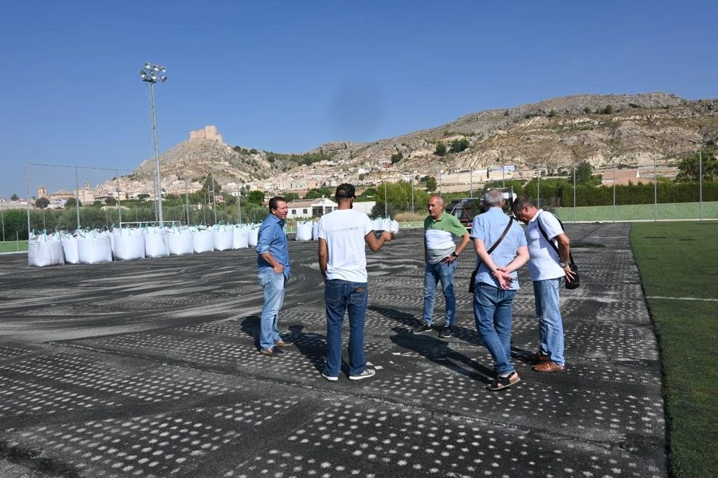 El alcalde de Mula, Juan Jesús Moreno, junto a los concejales Paco Llamazares y Vicente López, han visitado las obras mediante las que se mejoran las condiciones de los campos de estas instalaciones que disfrutan durante todo el año centenares de niños y jóvenes del municipio de las Escuelas Deportivas y los clubes deportivos.
