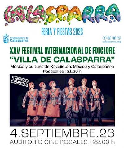 En esta 25ª edición los países invitados son Kazajistán < Grupo Naz, Danza y Teatro > y México < Grupo Fusión Folclórica >, la Asociación Cultural-Folclórica Rondalla de Calasparra completa la noche de folclore en el Auditorio Cine Rosales el lunes 4 de septiembre (entrada libre).