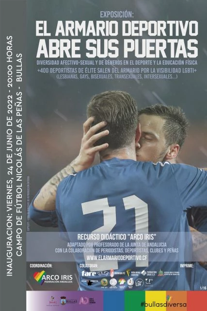 Bullas celebra el Día Internacional del Orgullo LGTBIQ+ con una variada programación de actividades que darán comienzo mañana viernes 24 de junio, a las 20:00 horas, en el Campo de Fútbol Nicolás de las Peñas, con la inauguración de la exposición "El armario deportivo abre sus puertas", elaborada y cedida por ARCOIRIS, federación Andaluza LGBTI+, que recoge la diversidad afectivo-sexual y de géneros en el deporte y la educación física, en la que más de 400 deportistas de élite salen del armario por la visibilidad LGTBIQ+. La exposición cuenta con 16 paneles de información y sensibilización para trabajar la tolerancia y el respeto, promoviendo un deporte sin prejuicios que apueste por la diversidad.