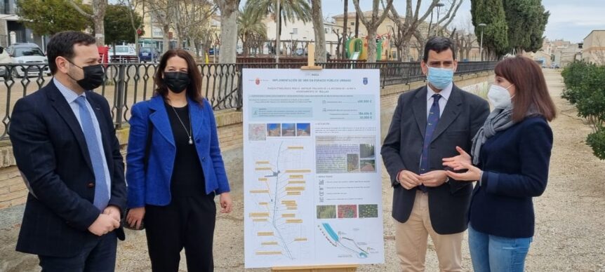 La Alcaldesa de Bullas, María Dolores Muñoz, y el consejero de Fomento e Infraestructuras, José Ramón Díez de Revenga, han presentado hoy la subvención para implementar Soluciones Basadas en la Naturaleza en el municipio, dentro de la Estrategia Regional de Arquitectura y Construcción Sostenible (EACS). Con dicha subvención, se creará un itinerario etnológico por el antiguo trazado de la acequia de La Rafa. El paseo se repoblará con vegetación autóctona tapizante entre la arboleda con especies arbustivas y aromáticas. El muro perimetral de la zona del nacimiento se recubrirá con planta trepadora que ejerza la función de sumidero de carbono. El proyecto incluye la recreación del trazado de la acequia a modo de Sistema de Drenaje Sostenible (SUDS) para la recogida de agua de lluvia, almacenamiento y posterior uso de riego en espacios públicos. Además, en toda esta zona se empleará pavimento drenante granular que permita la infiltración de aguas de lluvia, y se creará una barrera vegetal de cipreses y un jardín vertical para mejorar la visión de la zona.