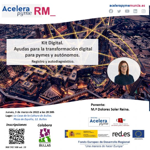 El próximo jueves 3 de marzo a las 20:30 h. en el auditorio de la Casa de la Cultura habrá una jornada sobre "Kit Digital. Ayudas para la transformación digital para autónomos y pymes". Esta jornada correrá a cargo de la Oficina Acelera Pyme de la Región de Murcia (https://acelerapymemurcia.es/) y contará con María Dolores Soler Reina como ponente. El Kit Digital (https://www.acelerapyme.gob.es/kit-digital) es el programa de ayudas del Plan de Recuperación promovido por el Gobierno de España para impulsar la digitalización de pymes y autónomos. En esta jornada, más concretamente, se explicará cómo acelerar la transformación digital de tu pyme enfocando la misma al registro y al autodiagnóstico. Para asistir es necesario inscribirse en el enlace https://forms.gle/ukK7vhyYj7xxtKZSA o llamando al teléfono 968 74 15 00 (Extensión 33).