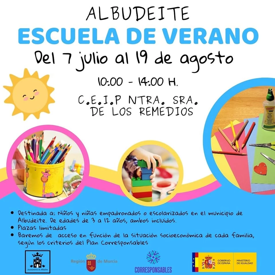 La Concejalía de Educación, Mujer e Igualdad del Ayuntamiento de Albudeite pone en marcha la Escuela Vacacional de Verano, en el marco del Plan Corresponsables, que se desarrollará del 7 de julio al 19 de agosto y la primera semana de septiembre, en jornada de mañanas (10:00 a 14:00 h.) para favorecer la conciliación laboral y familiar.
