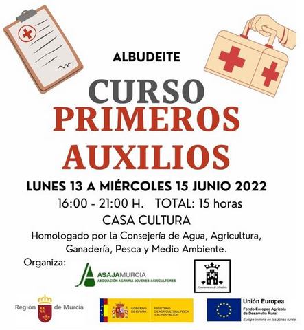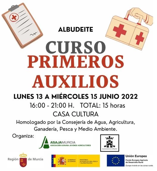 Los días 13, 14 y 15 junio hay programada una acción formativa gratuita de primeros auxilios, organizada por la Asociación Agraria de Jóvenes Agricultores ASAJA Región de Murcia y el Ayuntamiento de Albudeite, que se imparte en la Casa de la Cultura de Albudeite.El curso tiene una duración de 15 horas, en horario de 16:00 a 21:00 h. Además, está homologado por la consejería de Agua, Agricultura, Ganadería, Pesca y Medio Ambiente.Más información llamando al 968 66 75 02, en el WhatsApp 698 95 63 69 o a través del correo electrónicoEsta dirección de correo electrónico está siendo protegida contra los robots de spam. Necesita tener JavaScript habilitado para poder verlo.