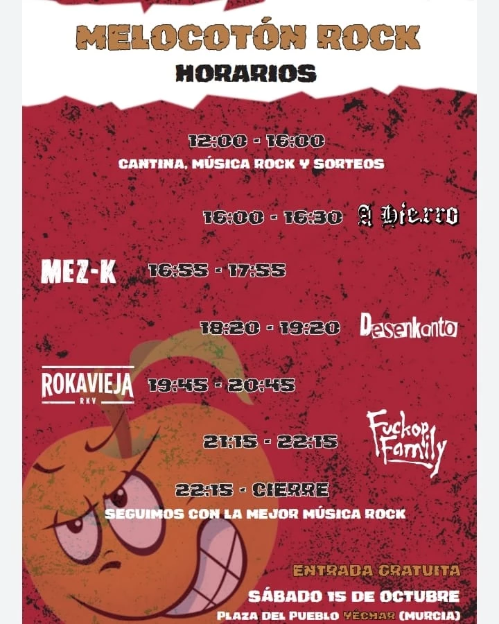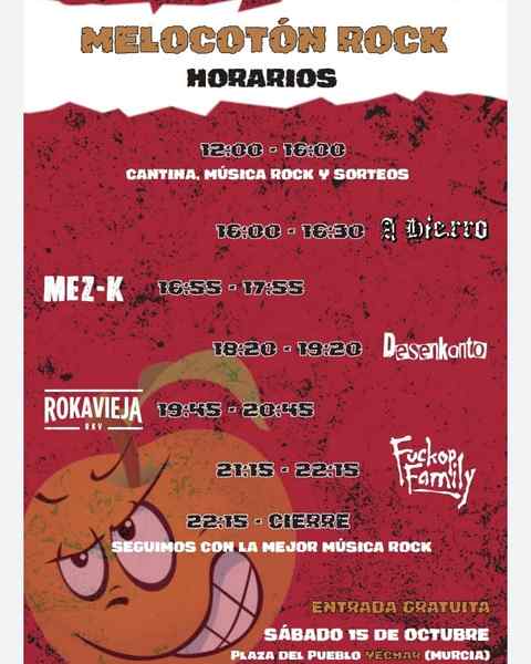 Fuckop Family, quedando los horarios de la siguiente manera:HORARIOS MELOCOTON ROCKSÁBADO 15 DE OCTUBRE12:00h - Cantina, música rock y sorteos.16:00h - A Hierro16:55h - MEZ-K18:20h - Desenkanto19:45h - ROKAVIEJA21:15h - Fuckop Family22:15h - Música Rock hasta cierre¡Os esperamos a todas!