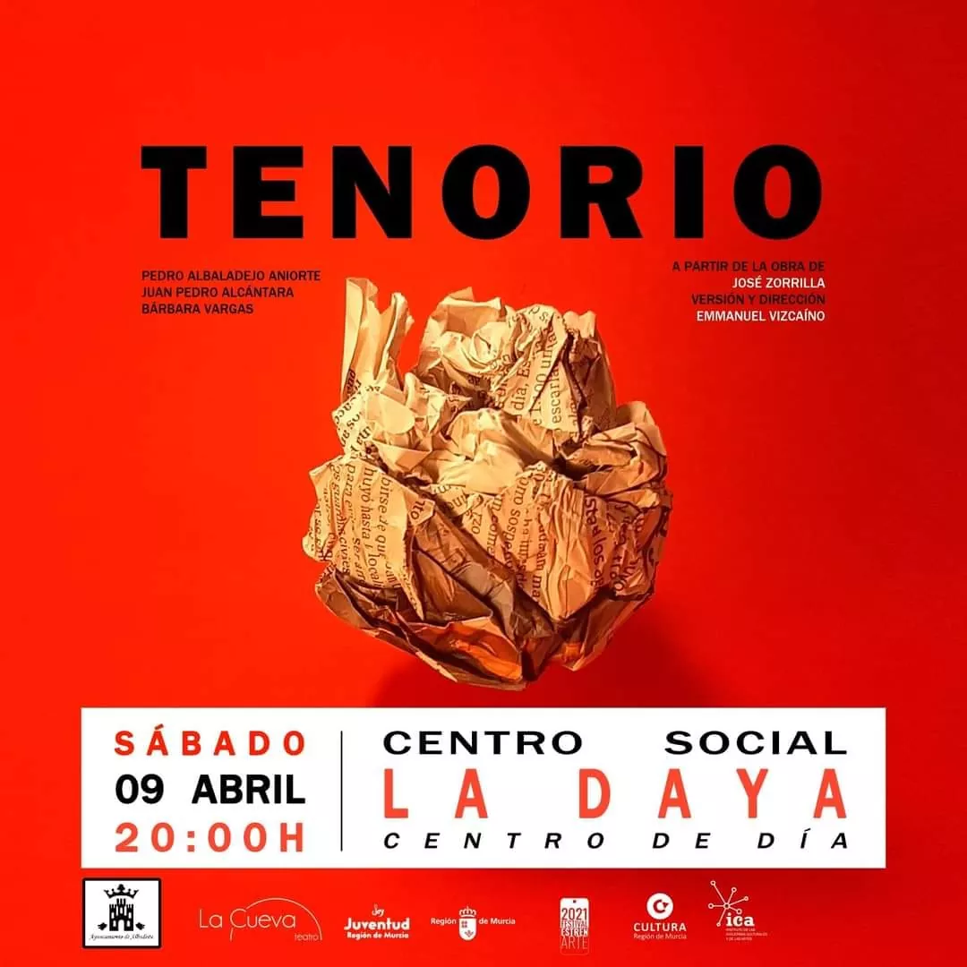 El próximo sábado, 9 de abril, la compañía La Cueva Teatro ofrecerá una versión particular y en clave de humor de todo un clásico "El Tenorio".Este TENORIO es una comedia sin pretensiones, una propuesta enverso, un juego, una invitación al público a reflexionar acerca de lafigura de Don Juan desde una mirada actual.Os esperamos, a las 20:00 h. en el Centro Social La Daya (Centro de Día), con entrada gratuita hasta completar aforo.Esta es una actividad organizada por la Concejalía de Cultura del Ayuntamiento de Albudeite, con la colaboración del ICA Instituto de las Industrias Culturales y de las Artes Región de Murcia.