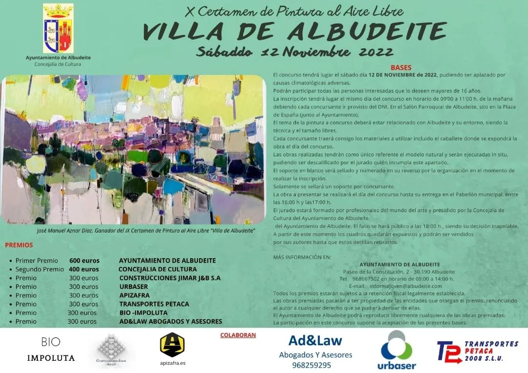 El Certamen de Pintura al Aire libre “Villa de Albudeite” que, en este año 2.022 cumple su décima edición y tendrá lugar el próximo sábado, 12 de noviembre.Esta actividad de ámbito cultural ha contado con amplia participación entre los aficionados al mundo del arte y más concretamente a la pintura, alcanzando un nivel nacional entre los inscritos y premiados en las últimas ediciones.Para esta décima edición del Certamen, podemos prever una importante participación de aficionados a la pintura que se darán cita en Albudeite, lo que supone promover la dinamización turística de nuestro pueblo, a través de la cultura.Una oportunidad para que disfrutéis de nuestro municipio bajo la mirada artística de los pintores que nos viisitan.BASES:El concurso tendrá lugar el sábado día 12 DE NOVIEMBRE de 2022, pudiendo ser aplazado por causas climatológicas adversas.Podrán participar todas las personas interesadas que lo deseen mayores de 16 años.La inscripción tendrá lugar el mismo día del concurso en horario de 09’00 a 11’00 h. de la mañana debiendo cada concursante ir provisto del DNI. En el Salón Parroquial de Albudeite, sito en la Plaza de España (junto al Ayuntamiento),El tema de la pintura a concurso deberá estar relacionado con Albudeite y su entorno, siendo la técnica y el tamaño libres.Cada concursante traerá consigo los materiales a utilizar incluido el caballete donde se expondrá la obra el día del concurso.Las obras realizadas tendrán como único referente el modelo natural y serán ejecutadas in situ, pudiendo ser descalificado por el jurado quién incumpla este apartado.El soporte en blanco será sellado y numerado en su reverso por la organización en el momento de realizar la inscripción.Solamente se sellará un soporte por concursante.La obra a presentar se realizará el día del concurso hasta su entrega en el Pabellón municipal, entre las 16:00 h y las17:00 h.