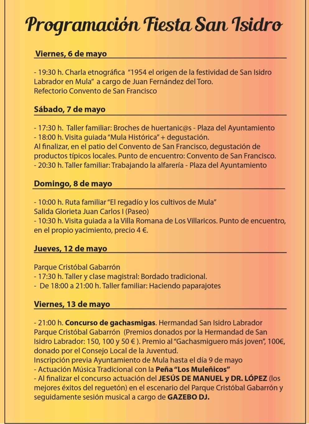 PROGRAMACIÓN:Charlas, talleres y muestras de folclore completan los festejos en honor a San Isidro durante las Fiestas de Primavera 2022Se celebran del 6 al 15 de mayo. El sábado 14 será el día grande de los festejos con la procesión de San Isidro, bendición de los campos y la huerta y el desfile de carrozas huertanasEn el parque Cristóbal Gabarrón quedará instalado el recinto festero con las carpas huertanas donde se celebrarán grandes conciertos para todos los asistentesLa concejalía de Festejos del Ayuntamiento de Mula ha organizado, junto con las concejalías de Turismo y de Cultura, y contando con el estrecho trabajo y colaboración de la Hermandad de San Isidro, con motivo de las Fiestas Primavera en honor a San Isidro 2022, una extensa programación festiva y de ocio relacionada con San Isidro y las raíces huertanas de Mula que dará comienzo este viernes 6 de mayo con la charla etnográfica ‘1954 el origen de la festividad de San Isidro Labrador en Mula’ a cargo de Juan Fernández del Toro en el Refectorio del Convento de San Francisco a partir de las 19.30 horas.Para el sábado 7 de mayo, en la plaza del Ayuntamiento a partir de las 17.30 horas se han programado los talleres familiares ‘Broches de huertanic@’ y ‘Trabajando la alfarería’.El domingo 8 de mayo tendrá lugar una ruta familiar para conocer ‘El regadío y los cultivos de Mula’. La salida está prevista a las 10.00 horas desde la Glorieta del Paseo.El jueves 12 de mayo, en el parque Cristóbal Gabarrón se celebra un taller y clase magistral de Bordado Tradicional a las 17.30 horas. Ese mismo día, de 18 a 21.00 horas, taller familiar ‘Haciendo paparajotes’.La Hermandad de San Isidro Labrador organiza el viernes 13 de mayo, el tradicional Concurso de Gachasmigas que tendrá lugar en el parque Cristóbal Gabarrón a partir de las 21.00 horas. Las inscripciones para los participantes en el concurso deben realizarse antes del 9 de mayo en el Ayuntamiento de Mula. Se establecen premios de 150, 100 y 50 euros, donados por la Hermandad de San Isidro Labrador, para las tres mejores sartenes de gachasmigas.Además, el Consejo Local de la Juventud otorgará un premio de 100 euros al ‘gachasmiguero’ más joven.Esa noche, actuación de Música Tradicional con la Peña Los Muleñicos. Al finalizar el concurso, actuación de Jesús de Manuel y Dr. López en el escenario del Parque Cristóbal Gabarrón. La noche acabará con una sesión musical a cargo de Gazebo Dj.El sábado 14 de mayo, Misa Huertana en honor a San Isidro a las 10.30 horas en la parroquia de Santo Domingo. Acabada la misa, procesión con el patrón de los campos por las calles Santo Domingo, Martín Perea, Jardín, Mártires, Arcilla, Emeterio Cuadrado, Boticas y plaza del Ayuntamiento. Al término de la procesión, entrega de ofrendas al santo y bendición de los campos y las huertas en la plaza del Ayuntamiento.El sábado 14, a partir de las 18.00 horas, desfile de carrozas huertanas. El itinerario será el de costumbre. Las inscripciones deberán realizarse en las dependencias de Policía Local hasta el jueves 12 de mayo hasta las 12.00 horas. El sorteo del orden de carrozas tendrá lugar a las 20.00 horas.A su llegada al parque Cristóbal Gabarrón, concierto de Los Happys y actuación de King África. Cierra la noche Gazebo Dj.Desde la concejalía de Festejos animan a todos los vecinos a disfrutar de todas las actividades propuestas. “Han sido dos años en los que hemos vivido un San Isidro diferente pero este año toca volver a salir a la calle con nuestros trajes y refajos y disfrutar de la música y los sabores de la primavera”, resaltaba Alicia Zapata.Además, este año, para niños menores de 10 años, servicio de ludoteca en el parque Cristóbal Gabarrón. El viernes 14 de mayo estará instalada de 20 a 00.00 horas. El sábado 15 de 11 a 14.00 horas y de 20 a 00.00 horas. El domingo 16 de mayo, de 11 a 14.00 horas.A cargo de la peña Alegría Muleña, durante las mañanas de los días 12 y 13 de mayo, charlas Fiesta y Folclore San Isidro en los centros educativos. Visitarán el Colegio Santa Clara, el Colegio Cristo Crucificado, el Colegio Anita Arnao y Florentino Bayona.Concursos San Isidro 2022Se han organizado los concursos de Decoración de Balcones, Ventanas, Entradas de Edificios, Comercio y Hostelería para profesionales y particulares que, en esta segunda edición, contará con premios de 100, 74 y 50 euros en vales de compra para cada una de las categorías.También se organiza por primera vez un Concurso de Ornamentación de Carpas en las que podrán participar todas las peñas que se encuentren ubicadas en carpas del parque Cristóbal Gabarrón. La peña cuya carpa resulte ganadora obtendrá la devolución de su pago, 200 euros, por gentileza de la empresa El Plan del Mono. Se tendrá en cuenta los valores estéticos, costumbristas y tradicionales que realcen las cualidades propias de las Fiestas en honor a San Isidro, patrón del campo y la huerta.Para las carrozas que participen en el desfile también se establece un concurso a la carroza mejor adornada con escenas o elementos huertanos. Se tendrá en cuenta los valores estéticos, costumbristas y tradicionales que sirvan para dar mayor visibilidad al desfile de carrozas. Se establece un premio de 200 euros que otorga el Ayuntamiento de Mula.En el parque Cristóbal Gabarrón se instalará durante todas las fiestas un ‘Punto Violeta’ por unas fiestas libres de acosos y de agresiones.