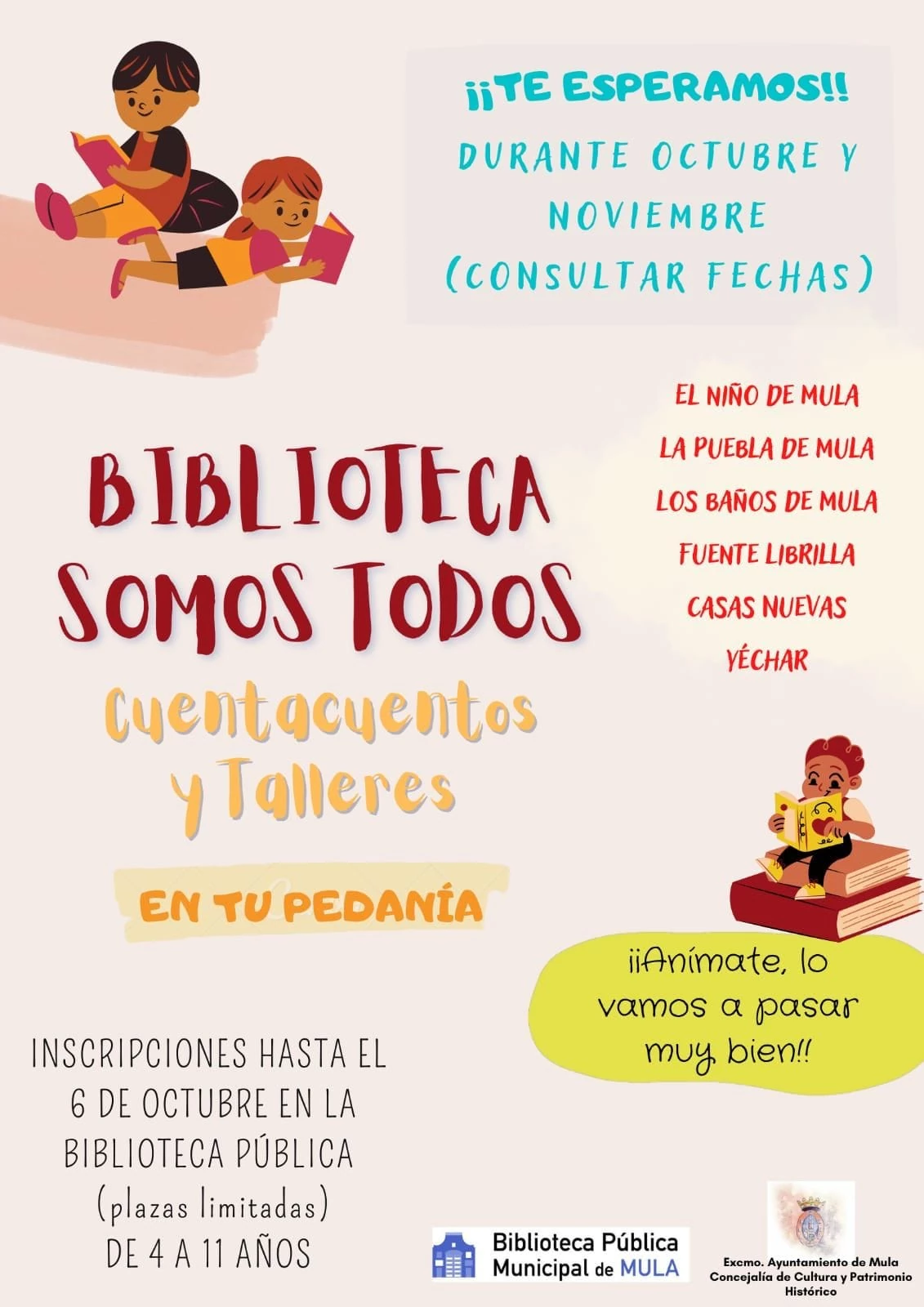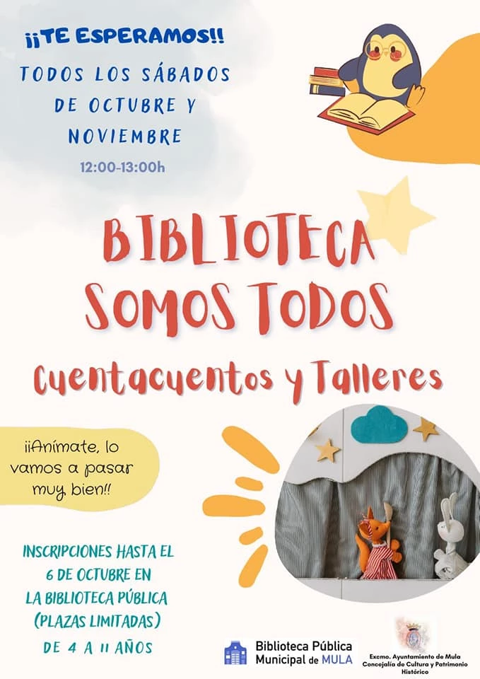 La Biblioteca Pública Municipal organiza para Mula y las pedanías de El Niño, La Puebla, Los Baños, Fuente Librilla, Casas Nuevas y Yéchar cuentacuentos y talleres dirigidos para niños de entre 4 y 11 años.