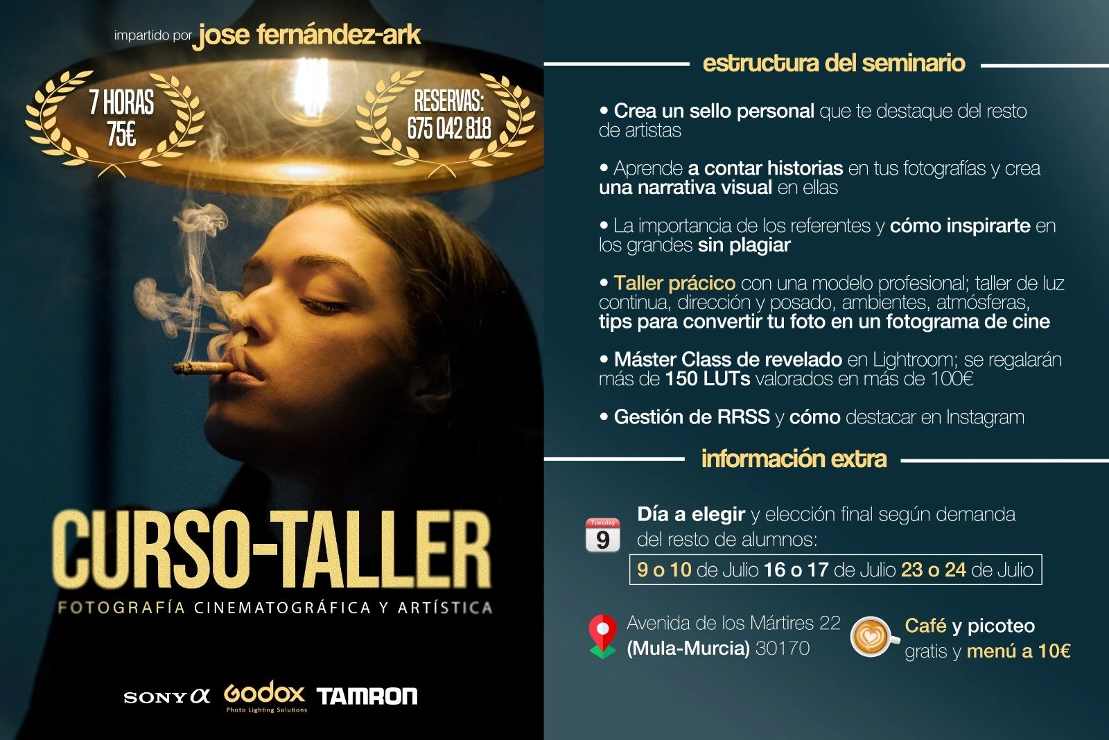MULA. CURSO-TALLER FOTOGRAFÍA CINEMATOGRÁFICA Y ARTÍSTICA.- Impartido por José Fernández-Ark. Si te gusta la fotografía, si amas el cine. Seas profesional o aficionado, no te puedes perder este seminario que tendrá lugar en el próximo mes de julio aquí, en Mula.