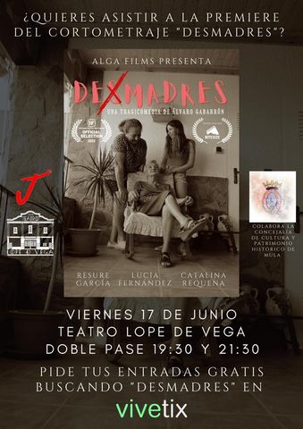 ¿Quieres asistir gratis a la premiere del tan esperado cortometraje Desmadres?¡Puede ir todo el mundo!TEATRO LOPE DE VEGA (Mula)Calle Don Pedro Luis, 5, 30170 Mula, MurciaDía 17 de JUNIODOBLE PASE:- 19:30- 21:30Se estrena la premiere del cortometraje "Desmadres" del director y guionista Álvaro Gabarrón, producido por Alga Films.Habrá un coloquio de bienvenida, que presentará la actriz Ángela López. En la charla las actrices principales junto al director hablarán acerca del proyecto.¡Se proyectará en primicia el cortometraje y habrán muchas sorpresas durante la gala!Organiza: Ayuntamiento de Mula, Concejalía de Cultura y Patrimonio Histórico, Concejalía de Juventud y Alga Films.Pide tus entradas aquí: https://vivetix.com/entradas-premiere-desmadres-teatro-lope-de-vega-mula-murcia?sUna vez adquiridas las entradas. Llegará al correo que habéis indicado, un código QR que se os escaneará al entrar.IMPORTANTERecuerda llevar el ticket ya sea online o impreso para presentarlo en la entrada.Se recomienda estar mínimo 15 minutos antes, ya que hay dos pases y a la hora indicada comienza la presentación.