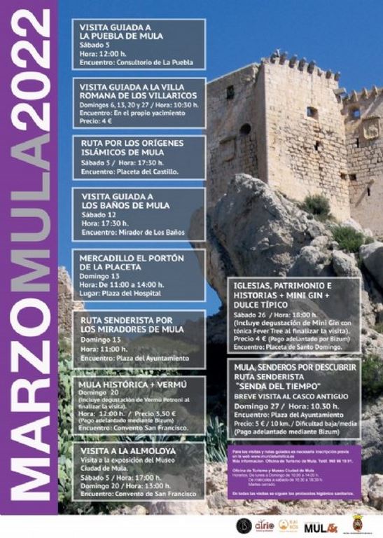 La concejalía de Turismo del Ayuntamiento de Mula ha diseñado una programación llena de actividades para el mes de marzo. El objetivo es que tanto los residentes como los visitantes puedan conocer y disfrutar del rico patrimonio que tiene el municipio de Mula. Visitas guiadas a la Puebla de Mula, a la Villa Romana de los Villaricos, a los Baños de Mula, a la exposición de la Almoloya, Ruta por los orígenes islámicos, por la Senda del Tiempo, por los miradores, Mula histórica, Iglesias, el mercadillo “El Portón de la Placeta”, etc…Son parte de una programación pensada para que todo aquel que lo desee pueda deleitarse con la cultura muleña, conocer sus monumentos y gozar de un entorno único. Para la Concejala de Turismo, Alejandra Martínez, estas actividades programadas son esenciales para incentivar el turismo en Mula y sus pedanías, y están diseñadas para el disfrute de cualquier persona que se una a ellas. Para las visitas y rutas guiadas es necesaria la inscripción previa en la web de Murcia Turística. Más información en la Oficina de Turismo de Mula, teléfono 968 66 15 01.