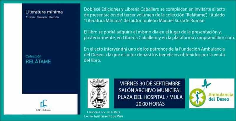 Este viernes 30 de septiembre a las 20 h presentación del tercer volumen de la colección "Relátame". Un conjunto de relatos del escritor Manuel Susarte Román que verá la luz bajo el título "Literatura Mínima".