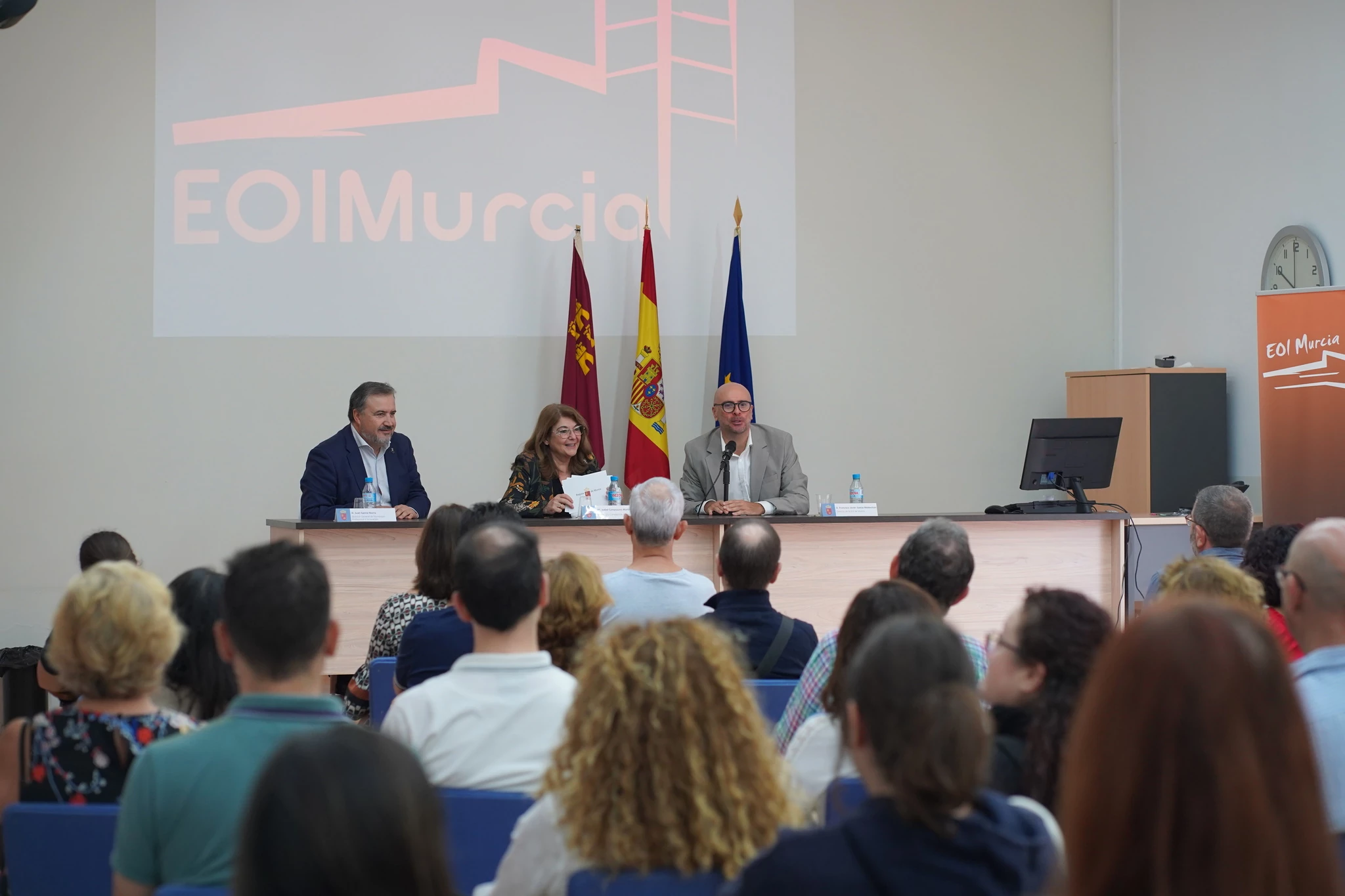 La consejera de Educación, María Isabel Campuzano, acompañada por el director general de Formación Profesional e Innovación, Juan García, asistió a la inauguración del curso en la EOI de Murcia. En su intervención, la titular del ramo recordó que “en nuestras escuelas se pueden aprender siete idiomas: alemán, árabe, chino, español para extranjeros, francés, inglés e italiano”.