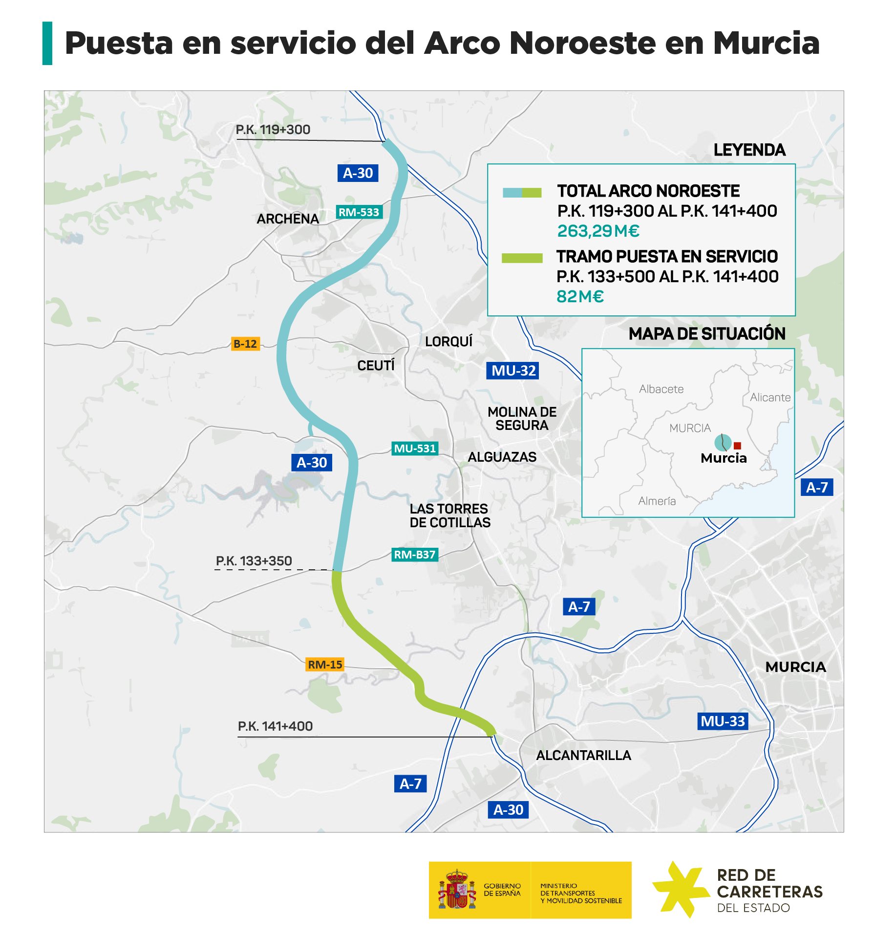 El Arco Noroeste está llamado a convertirse en el eje vertebrador del tráfico de paso entre el norte y el sur de la Región de Murcia, aliviando la presión sobre la Red de Carreteras del Estado a su paso por el área metropolitana de Murcia. La infraestructura mejora además la conectividad de numerosos municipios del entorno, entre ellos Archena, Molina de Segura, Lorquí, Villanueva del Río Segura, Ceutí, Alguazas, Campos del Río, Las Torres de Cotillas y Alcantarilla, facilitando el acceso a polígonos industriales y optimizando el transporte de mercancías en una zona con un potente tejido productivo y económico.